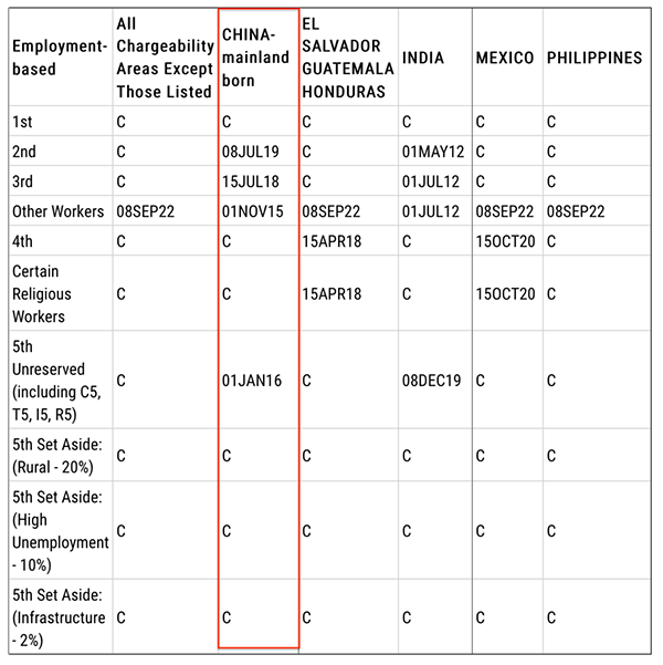表A – 最终裁定日(FAD) 表B – 递交申请日(DFA) 图片信息来源于网络,版权归原著所有 EB-1:EB-1对中国大陆地区出生申请人当前表A表B均没有排期,在美国境内申请这个类别的申请人可以同时递交I-140和I-485申请,EB-1是所有职业移民申请类别中可快速拿到绿卡的申请类别。 另外,从2022年9月15日起,移民局将会开始接受满足以下时间要求的EB-1C PP加急服务申请:在2022年1月1日之前提交的EB-1C申请。 移民局将不会受理不满足以上提交时间要求、类别要求的PP加急申请,移民局也不会受理新提交的EB-1C的I-140加急申请。 EB-2:EB-2类别双表在10月排期中分别前进了68天,11月排期双表停滞:表A排期为2019年6月8日,表B排期为2019年7月8日。 EB-3:EB-3在经历了非常灰暗的一整个2022财年,新财年的排期继续惨淡...EB-3双表10月分别前进了54天,11月排期又停了:EB-3表A排期为2018年6月15日,表B排期为2018年7月15日。 EB-5:11月排期停滞:表A排期为2015年3月22日,表B排期依旧停留在2016年1月1日。Set Aside,对应新法案出现的三类Reserved类别无排期。